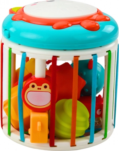 Terningens sider har elastiske, farverige bånd, gennem hvilke barnet kan presse klodser, hvilket understøtter udviklingen af finmotorikken. Sættet indeholder 7 klodser i forskellige former – hver med sin egen farve, tekstur eller grafik, som hjælper med at udvikle barnets taktile og visuelle sansning. Legetøjet er fremstillet af holdbare og sikre materialer uden skarpe kanter.