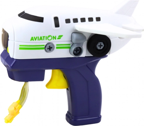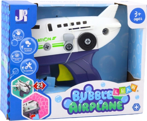 Sjov sæbeboble-pistol i form af et fly med montering. Ideel til udendørs leg. Sikker, uden batterier.