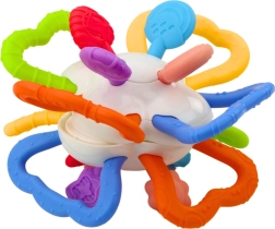 Legetøjet består af to bevægelige, roterende centrale dele, som barnet kan dreje på, hvilket hjælper med at øve greb og udvikler hånd-øje-koordination. Derudover er hele legetøjet omgivet af farverige, fleksible greb med forskellige former og teksturer, fremstillet af sikkert, blødt materiale, der minder om gummi. Disse elementer er ideelle til at bide i og giver lindring under tandfrembrud.