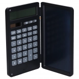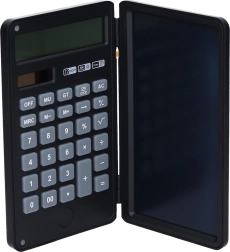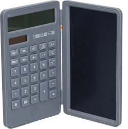 Når den er helt åbnet, måler lommeregneren 18 x 15 cm, hvilket giver komfortabel brug. Du kan vælge mellem to elegante farvevarianter: sort og grå.
