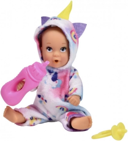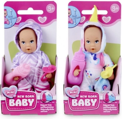 New Born Baby MINI dukke er et sjovt og interaktivt legetøj, som dit barn vil elske. Denne søde dukke drikker og tisser, og hendes pyjamas fås i to motiver: enhjørning og jungle.