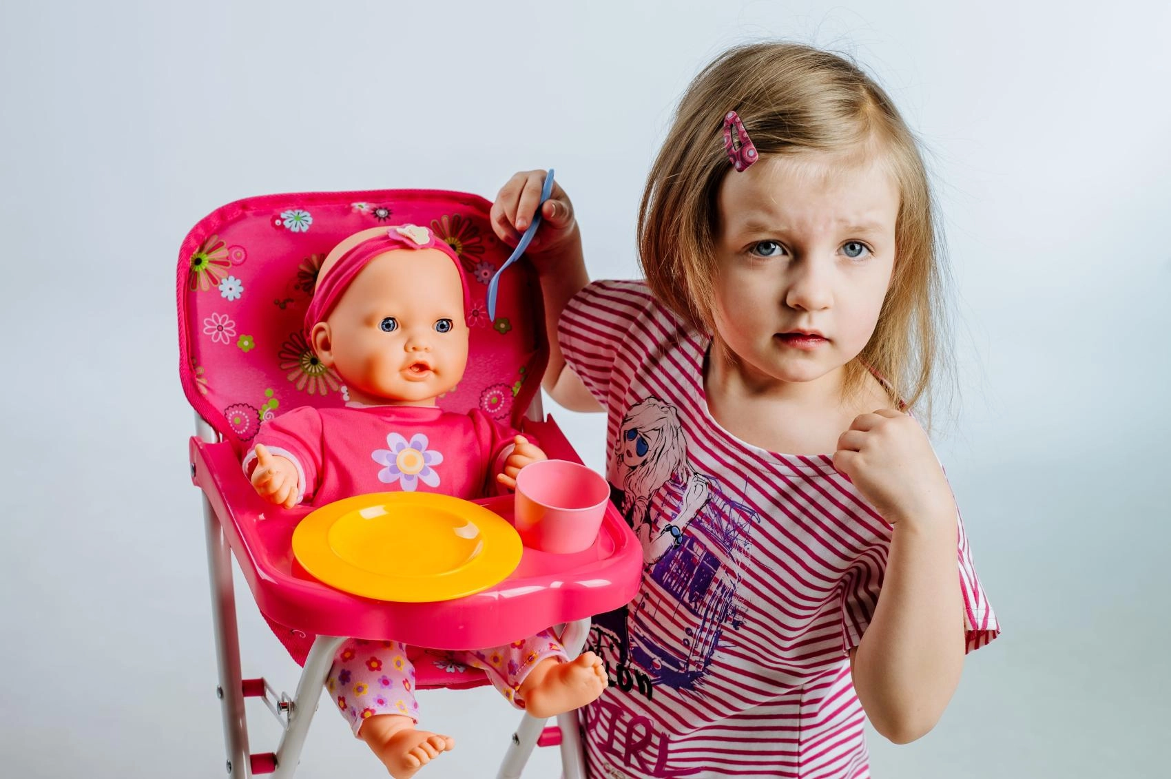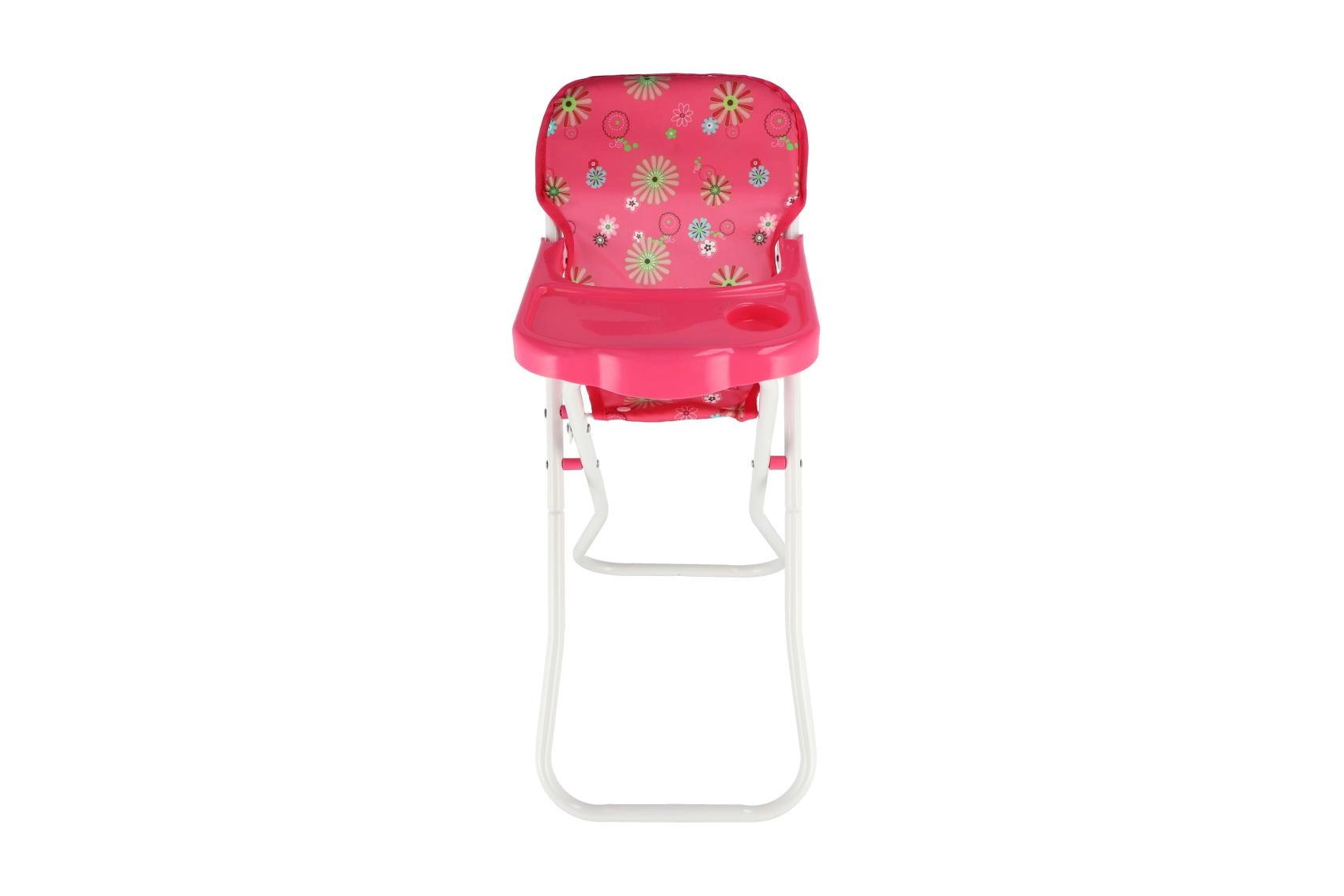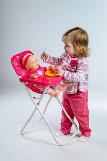 Denne høje dukkestol vil glæde alle små omsorgspersoner. Den tilbyder behagelig siddestilling med blomstret betræk, en praktisk plastbakke til fodring og en let, men stabil metal konstruktion. Takket være det pladsbesparende design kan den nemt bæres og opbevares.