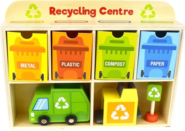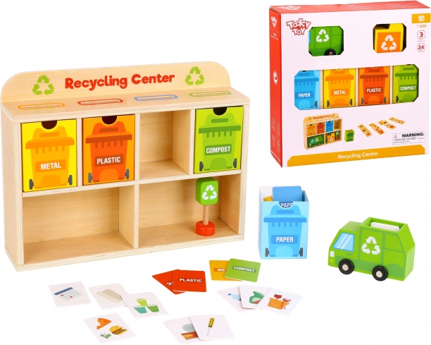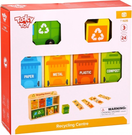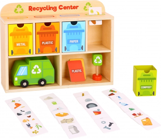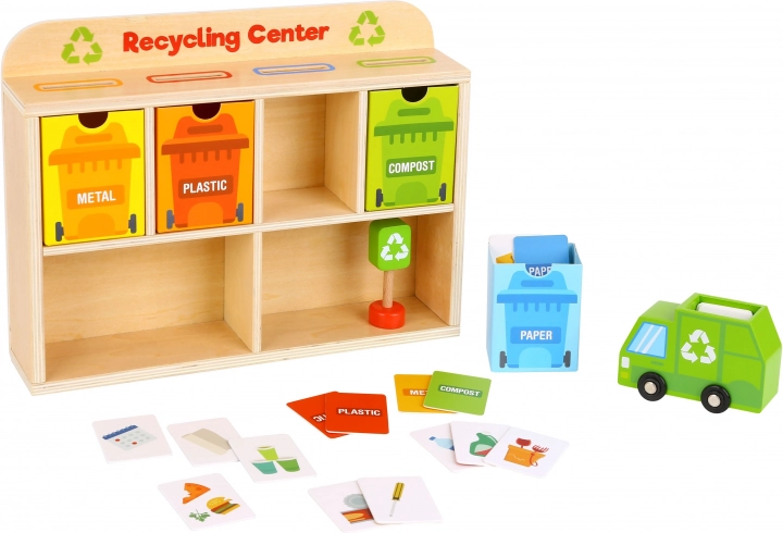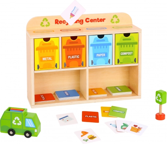 Med Genbrugscenteret fra Tooky Toy lærer børn, hvordan man sorterer affald korrekt. Hvert kort viser affald af forskellige materialer, som børn lægger i skraldebilen, derefter i sorteringsmaskinen og til sidst i den rigtige container, som er placeret i det træ skab.