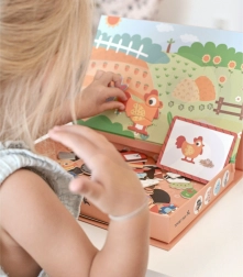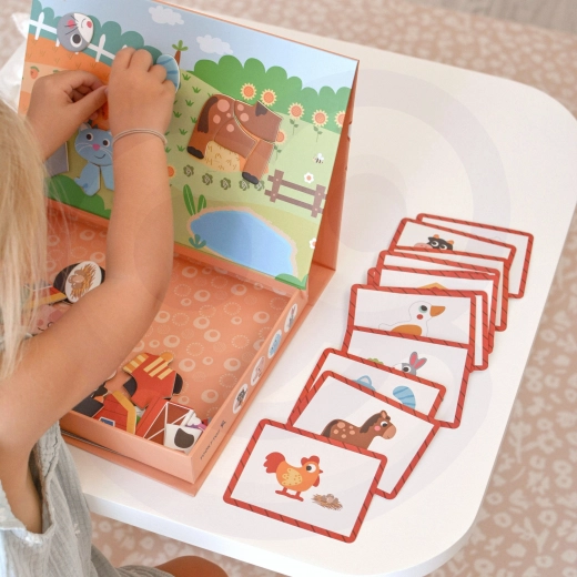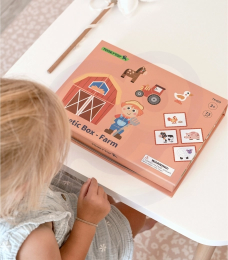 Med det magnetiske puslespil fra Tooky Toy oplever børn glæden ved legende læring på gården. Udvalgte motiver og figurer som stalddyr, bonde og æbletræ viser charmen ved livet på landet. Hvert projekt består af fire til fem magnetiske puslespilsbrikker, hvilket gør det muligt for børn at sammensætte deres egne gårdscener.
