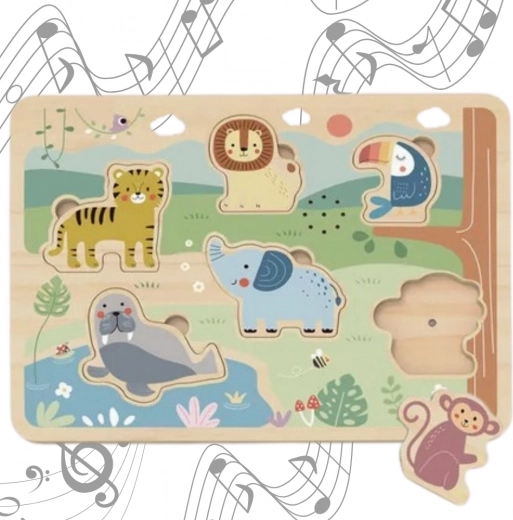 Tooky Toy træ interaktivt dyrepuslespil er et unikt legetøj, der bringer musikalsk legeglæde. Fremstillet af FSC-certificeret træ og malet med sikre farver, ideelt til børn fra 18 måneder.