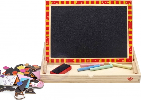 Dobbeltsidet trætavle Tooky Toy med magnetiske puslespil. Understøtter kreativitet og er sikker for børn.