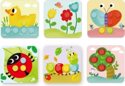 Denne puslespil indeholder 16 farverige klodser og 6 tavler med dyrefigurer. Klodserne placeres efter form for at fuldende billedet. Udvikler børns visuelle koordinering.