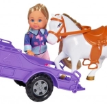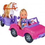 Dette sæt giver børn alt, hvad de behøver til deres rideeventyr. Dukken Evi Love kører en stilfuld lyserød cabriolet, som trækker en lilla trailer til behagelig transport af hesten. Takket være de roterende hjul og den aftagelige trailer er legen glidende og sjov både hjemme og på farten.