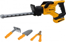 Børnenes havesæt indeholder en realistisk legetøjsversion af en elektrisk hækkeklipper med bevægelige plastklinger. Tryk blot på knappen, og det sikre “klippearbejde” kan begynde! Klipperen har et ergonomisk håndtag, et aftageligt batterimodul og elementer, der efterligner funktionerne på rigtigt haveværktøj. Sættet indeholder også håndredskaber: rive, skovl og grensaks.
