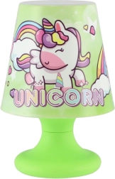 Skærmen med teksten “UNICORN” og den stabile fod sikrer tryg brug og et behageligt, diffust lys, der ikke forstyrrer søvnen. Den praktiske vippekontakt i bunden gør det let for børn at tænde og slukke lampen.