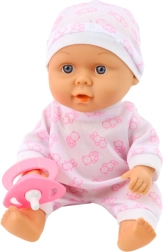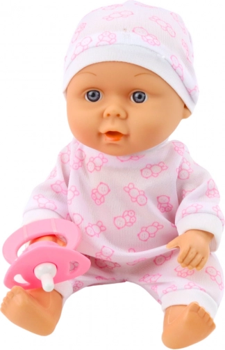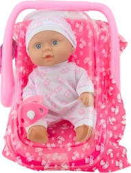 Der medfølger også en lyserød sut, som gør plejerollen endnu mere realistisk og engagerende. Dukken er fremstillet af børnesikre materialer, og dens kompakte mål passer perfekt til små hænder. Bæreselen er lavet i matchende materialer med et fint mønster, som giver hele sættet et attraktivt udseende.