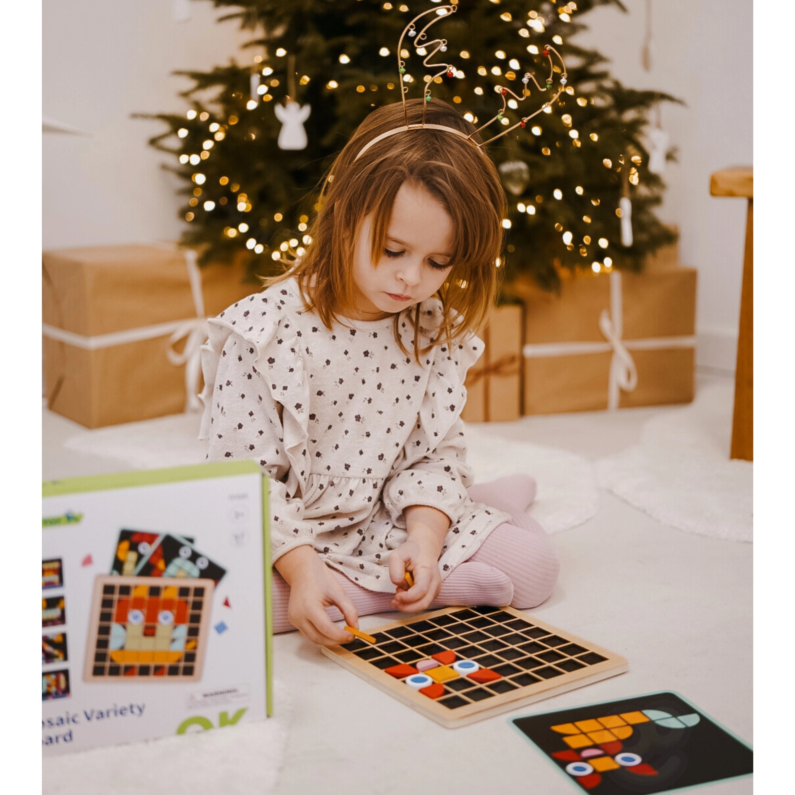 Tooky Toy træmosaik er det ideelle legetøj til at udvikle kreativitet og læring. Børn kan lægge efter de medfølgende kort eller skabe deres egne mønstre, hvilket udvikler fantasien og evnen til at skelne farver og former.