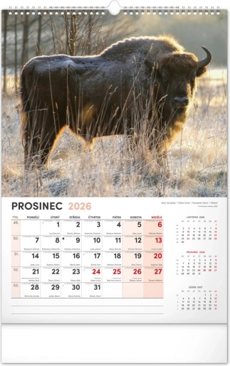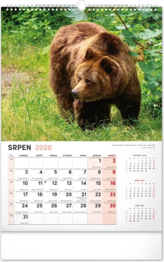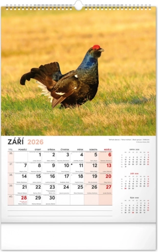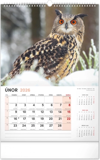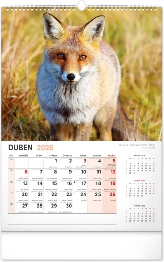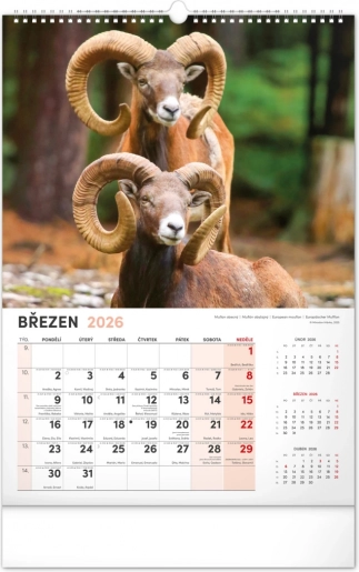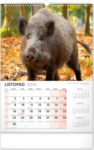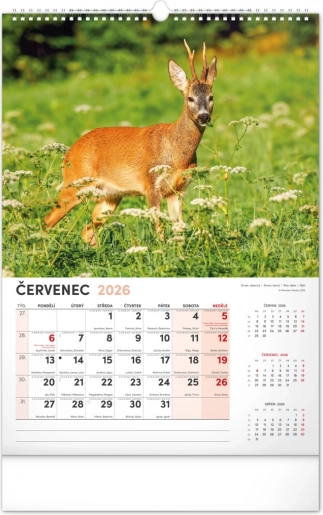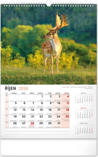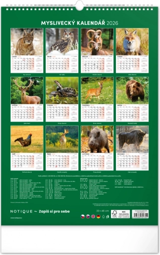 Vægkalender til jægere, der bringer imponerende fotografier af dyr fra de tjekkiske skove, sammen med vigtige oplysninger til jægere, inklusive jagtperioder og tider for solopgange og solnedgange.