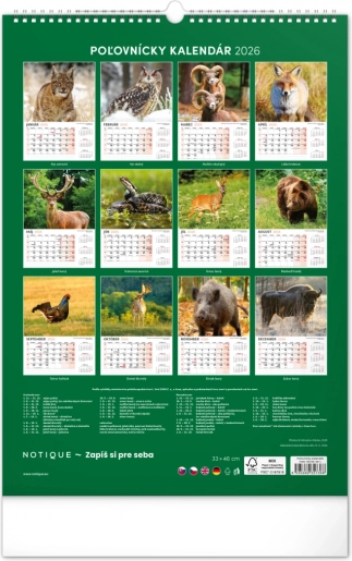 Vægkalender designet til jægere, som tilbyder imponerende billeder af dyr og oplysninger om jagtsæsoner og tidspunkter for solopgang og solnedgang.