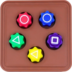 Sættet indeholder 5 farvede terninger, fremstillet med 3D-print i holdbar plast. Hver terning har en tydelig farve: rød, blå, gul, grøn og lilla, hvilket gør spillet lettere og tiltrækker opmærksomhed. Hver terning har karakteristiske symboler (cirkel, trekant, kvadrat).