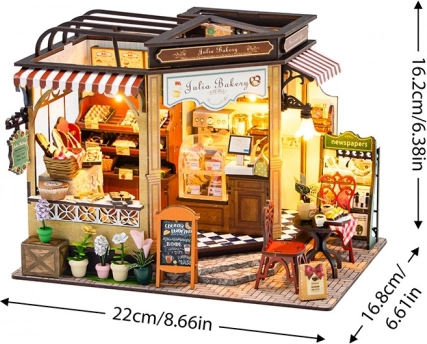 Oplev den fantastiske verden af miniaturer med dukkehuset Julies bageri. Sættet giver hyggelige stunder med bygning og tilpasning, med detaljeret udførelse og LED-belysning.