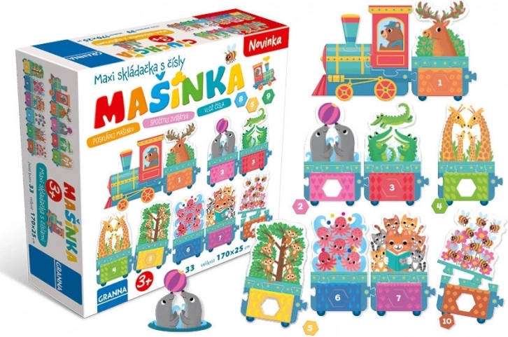 Med Granna Mašinka bliver det virkelig sjovt at tælle! Dette maxipuslespil lader børn samle et tog, tilføje vogne, tælle dyrene og lære at matche de rigtige tal.