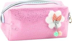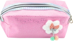Denne kosmetik- eller pengepung er fremstillet i en elegant lyserød nuance og dekoreret med fint glimmer. På forsiden findes en sød applikation formet som en fluffy sky med en sløjfe, hvortil der er fastgjort to dekorative kugler, som giver helhedsudtrykket en særlig charme.