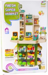 Forvandl dit barns værelse til et realistisk supermarked med det interaktive legetøj Friskt Supermarked. Dette sæt med 67 dele indeholder efterligninger af madvarer, drikkevarer, emballager, frugt og grønt, et kasseapparat med knapper, en prisscanner, terminal og udstillingshylder, så barnet kan være både ekspedient og kunde.