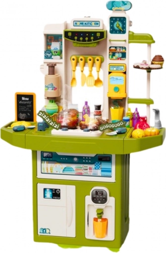 Legekøkkenet er udstyret med moderne interaktive funktioner: dampeffekt, realistiske madlavningslyde, farvede LED-lys og musik, som aktiveres via betjeningspanelet.
