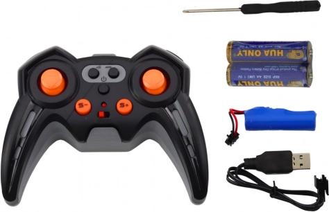 Med en moderne fjernbetjening på 2,4 GHz kan du styre lastbilen i fire retninger og bruge specialfunktioner som demonstration og afspilning af lyde.