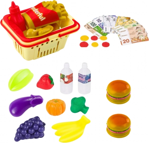 Børnelegesæt kasseapparat, kurv og dagligvarer med effekter