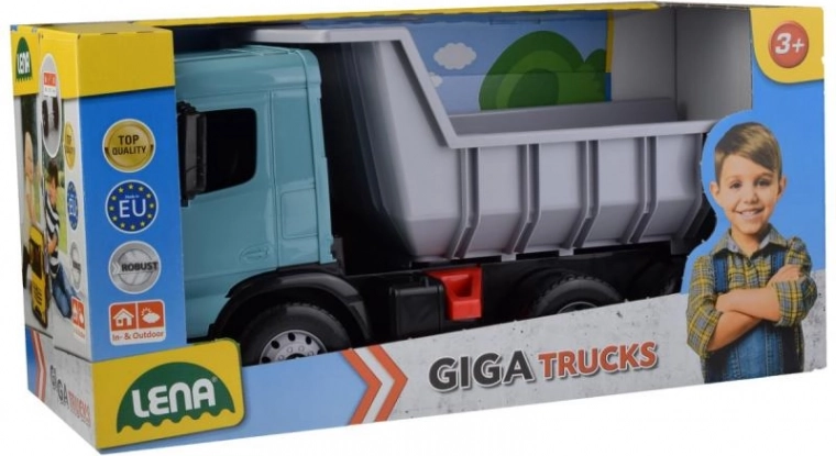 Stor tipbil Lena Giga Trucks Arocs i turkis. Holdbar plast, vipbart lad med lås, sikker udførelse, fremstillet i Tjekkiet. Til børn fra 3 år.