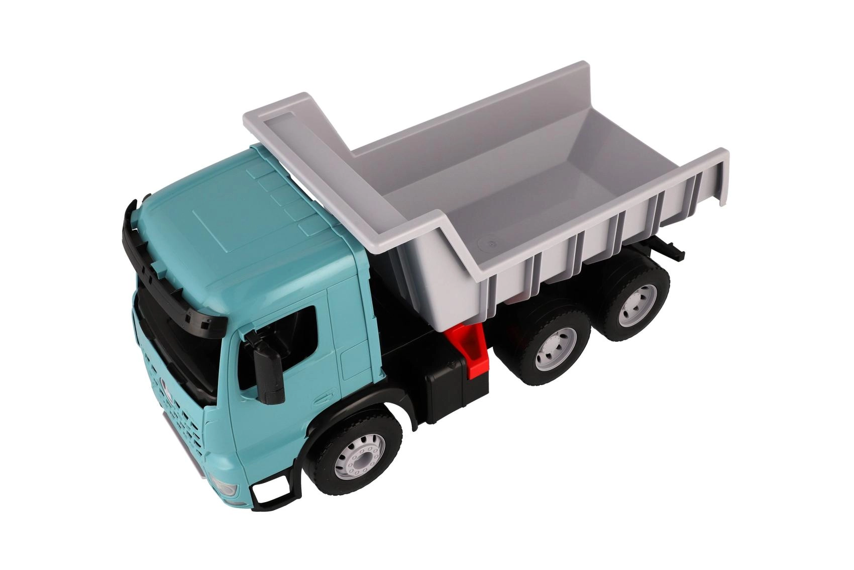 Stor plasttipvogn til børn fra 3 år med et realistisk udseende af MERCEDES-BENZ AROCS. Den tilbyder en rumlig ladkasse med praktisk lås mod utilsigtet tipning, holdbar konstruktion i kvalitetsplast og et moderne turkis-gråt design. Ideel til leg både inde og ude, til transport af sand, legetøj og fantasi.
