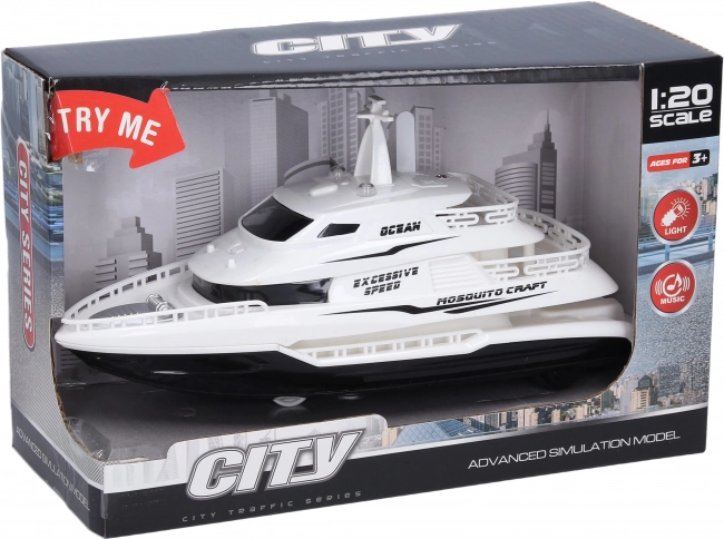 Denne hvide båd med inertihjul tiltrækker ikke kun med sit elegante design, men også med interaktive effekter, der gør den attraktiv for børn. Den giver timevis af sjov ved at simulere sejlads.
