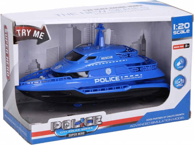 Blå båd med svinghjul og lys- og lydeffekter. Fantastisk supplement til børns vandlege. Dimensioner 22x7x10 cm.