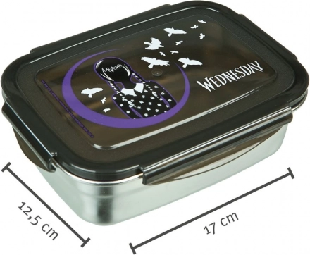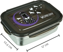 Madkasse med Wednesday-motiv med kapacitet på 550 ml, ideel til frokoster og snacks. Fremstillet af rustfrit stål med gennemsigtigt låg, den er holdbar og praktisk.