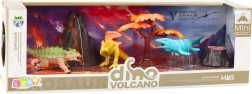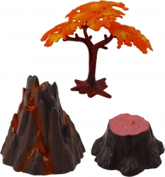 Sæt med realistiske dinosaurfigurer med vulkan og træ