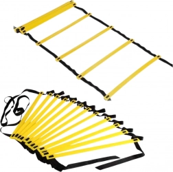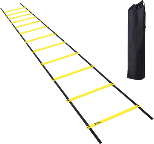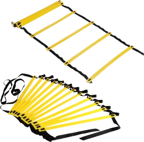 Træningsstigen er fremstillet af holdbar PVC og polyethylenremme, hvilket gør den modstandsdygtig over for intensiv brug, både indendørs og udendørs. Stigen har 12 justerbare trin, som gør det muligt at tilpasse afstandene til specifikke øvelser og brugerens niveau.