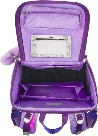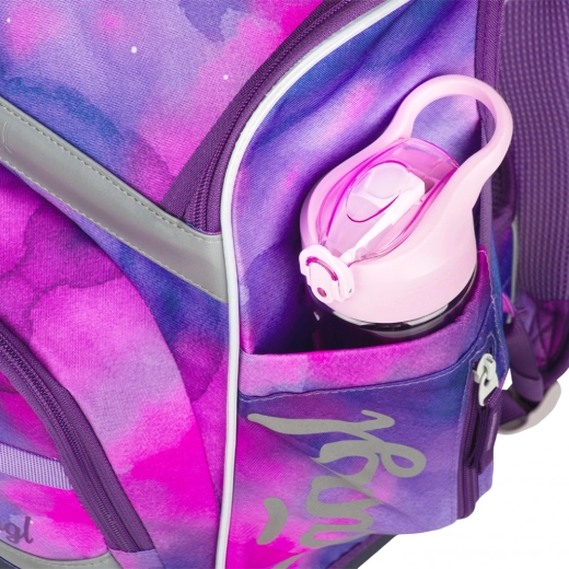 Barnets kreativitet kan udfolde sig takket være det unikke system med udskiftelige badges på aktetasken. Sikkerheden sikres af reflekterende elementer og pålidelige YKK-lynlåse. Den er designet med en fast bund og en vægt på 1.150 g for at holde formen og stå stabilt.