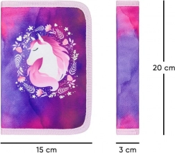 Komplet skolesæt BAAGL Zippy Plus Hest indeholder en let og ergonomisk skoletaske egnet til børn fra 1. klasse, et enkeltsidet penalhus med kvalitetslynlåse fra YKK og en praktisk pose til indesko eller sportsudstyr.