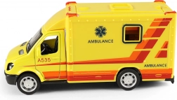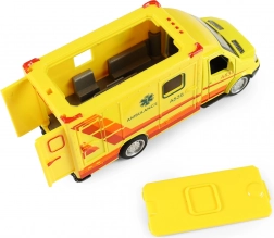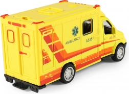 Førsteklasses legetøjsambulance i iøjnefaldende gul med solidt design i metal og robust plast. Takket være optræksmotoren er den klar til action – træk tilbage og slip. Realistiske detaljer, prints og gennemsigtige ruder understøtter fantasi og leg som redningsfolk.