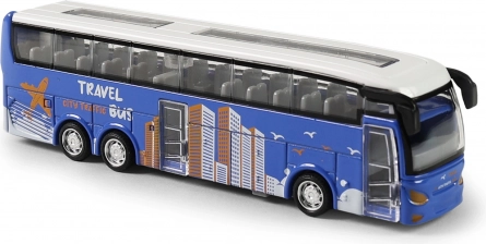 Mini metal langdistancebus med fritløb og åbningsdøre, længde 12 cm. Ideel til samlere og modelentusiaster.