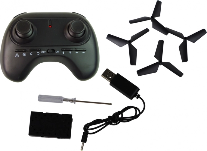 Pakken indeholder en fjernbetjening, ekstra propeller, USB-kabel og andet nyttigt tilbehør, der gør det lettere at vedligeholde og styre flyet. Flyet giver timers underholdning og udvikler dine flyvefærdigheder.