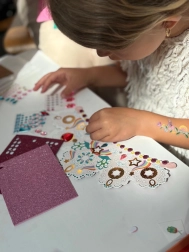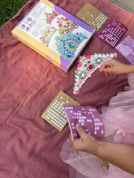 Selvklæbende “juveler” og glitrende elementer er lette at sætte på, så selv yngre børn kan lave smukke, unikke designs uden rod.