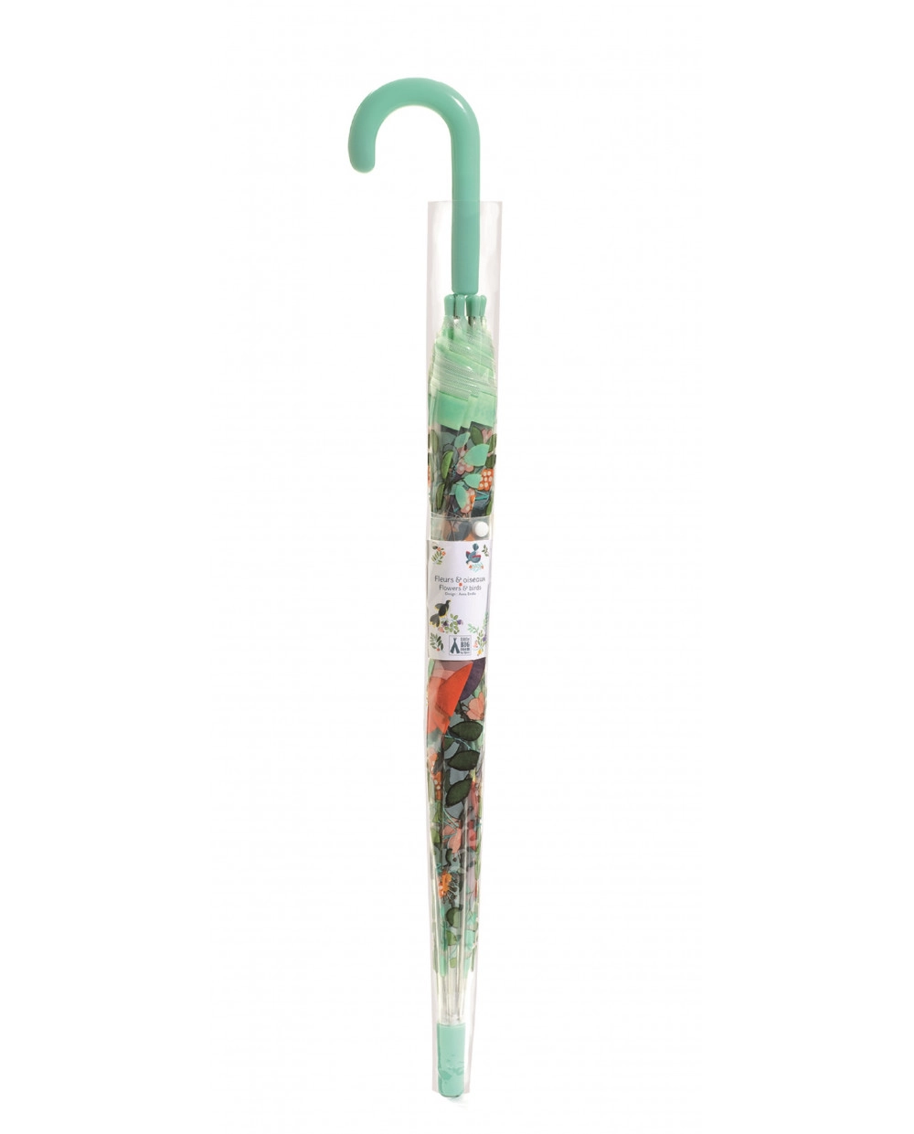 En stilfuld børneparaply med motiv af blomster og fugle vil glæde enhver lille eventyrer. Den har et behageligt grønt håndtag og en sikker trykknaplukning, så den er nem at åbne og lukke. Takket være en diameter på 70 cm beskytter den pålideligt mod regn og er let og nem at bære.