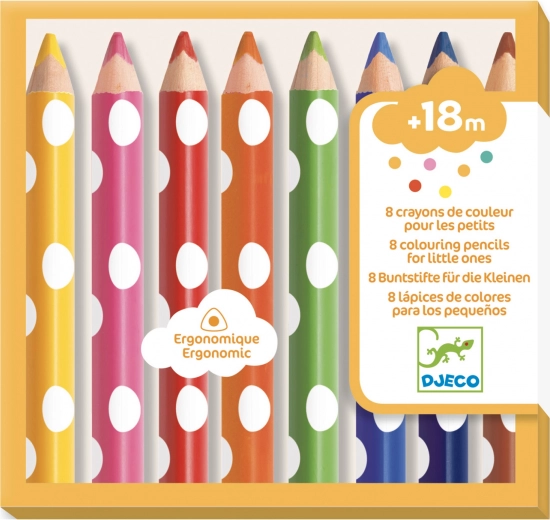 DJECO-farveblyanterne er designet specielt til de mindste børn, der lige er begyndt at opdage glæden ved at tegne og male. Den ergonomiske form gør dem lette at holde og behagelige at bruge. Farverne er intense og klare, hvilket hjælper børn med at skabe smukke kunstværker. Sættet indeholder otte farveblyanter i forskellige farver.