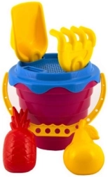 I sættet finder du alt, hvad du behøver til leg med sand, inklusive en spand, en si, en skovl, en rive og to forme.