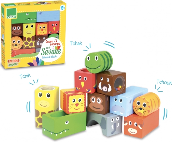 Oplev en verden af lyde og fantasi med VILAC Savanna træklodser. Sættet indeholder 11 sensoriske klodser, som hjælper børn med at udvikle finmotorik, høresans og hånd-øje-koordination. Det attraktive savannemotiv og de forskellige lydeffekter sikrer mange timers leg.