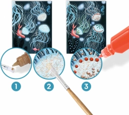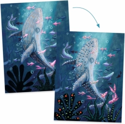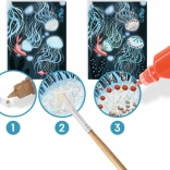 Oplev havets kreative verden med DJECOs kreative sæt. Børn skaber fire imponerende billeder med forskellige effekter ved hjælp af perlemorsfarver og pensel. Sættet tilbyder unik tekstureret maling til reliefprikker og -linjer, nem dosering takket være minibeholdere med spids og forskellige overfladeeffekter – perlemor, glitrende og mat.
