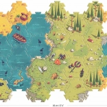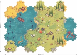 - 26 dobbeltsidede sekskantede brikker, 4 store vertikale kulisser på træfødder