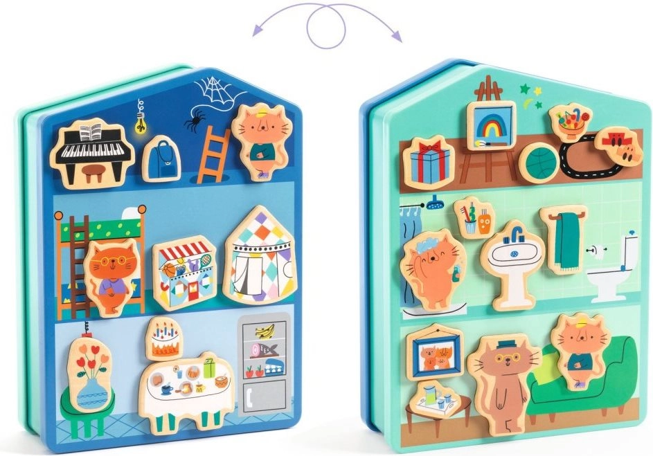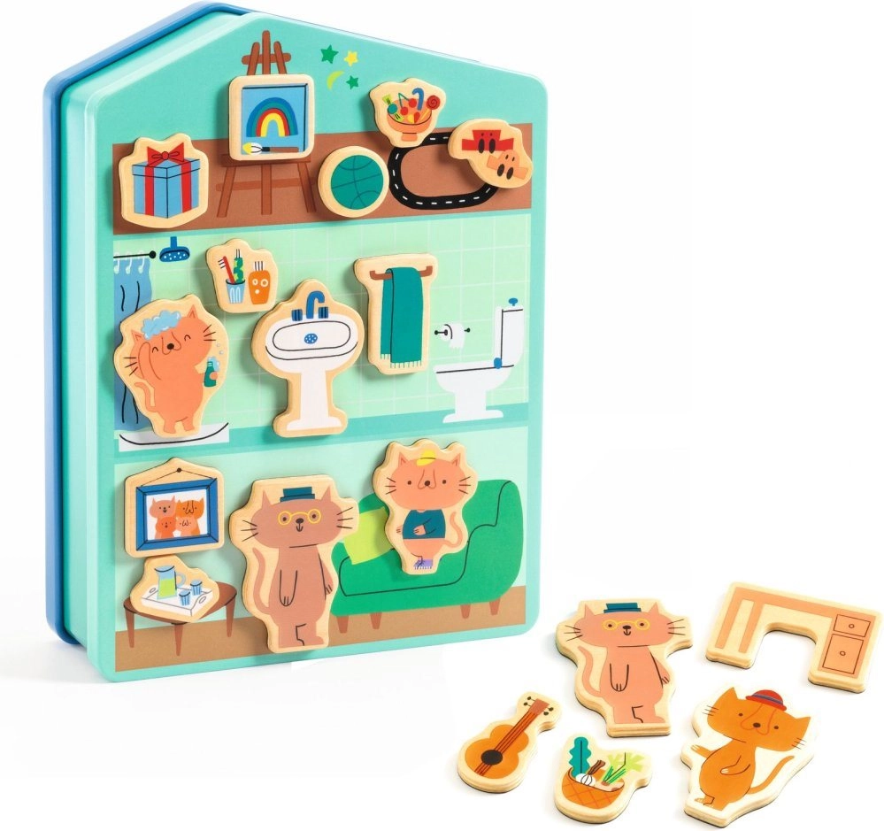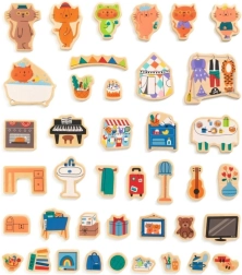Sættet indeholder 40 kvalitetsmagneter med kattefigurer og tilbehør til hjemmet. Børn kan udvide ordforrådet, fortælle historier og træne rumlig forestillingsevne, mens de dekorerer loft, soveværelse, køkken, stue, badeværelse og legerum.