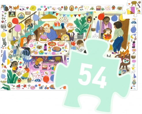 Oplev en fødselsdagsfest fuld af sjov med søgepuzzlen fra Djeco! At samle de 53 brikker i dette farverige puslespil vil glæde og samtidig udfordre ethvert barn.