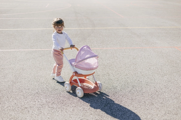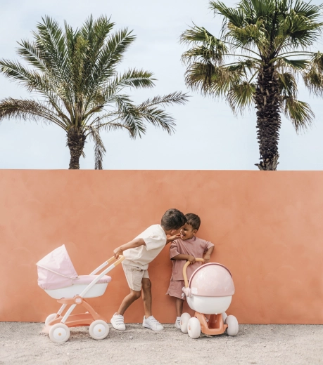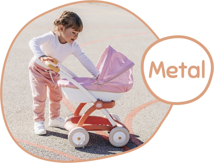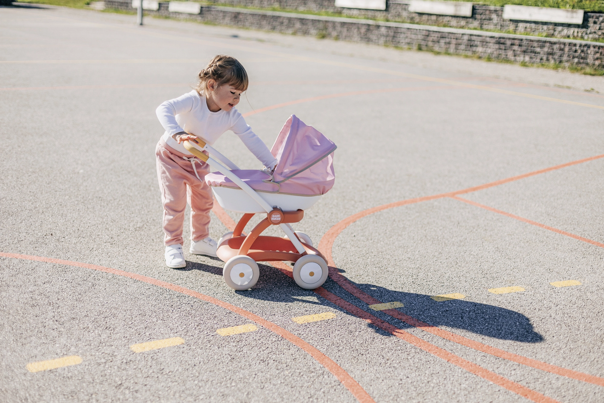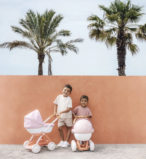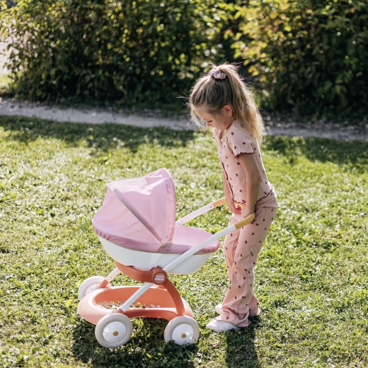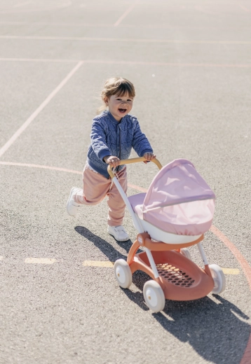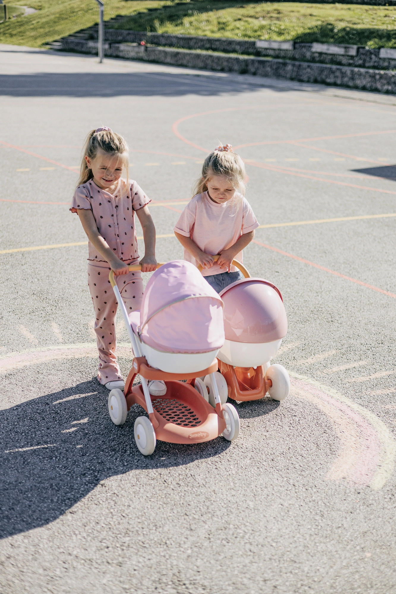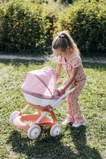 Dukkevognen Smoby Baby Nurse i en lyserød-abrikostrød-hvid kombination er som skabt til daglige ture med yndlingsdukken. Takket være metalrammen og de støjsvage hjul er kørslen jævn og stabil, mens det ergonomiske håndtag gør styringen let selv for mindre børn.