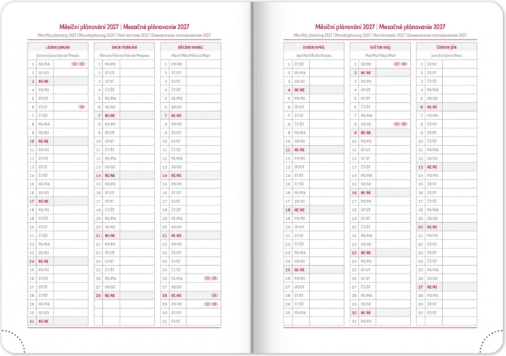 - Inkluderede planlægningskalendere for årene 2026–2027, inklusive månedlige og årlige oversigter.