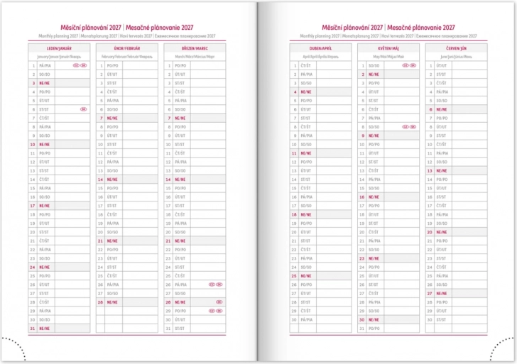 Denne daglige dagbog Notique Balakon 2026 bringer en elegant og samtidig praktisk måde at holde orden på din dagligdag. I mørkeblå, der er stilfuld og professionel, er dagbogen lavet af høj kvalitet overflademateriale, der er modstandsdygtigt over for skader. Dagbogens fordel er dens flersprogede skema, der inkluderer tjekkiske og slovakiske kalendere med engelske, tyske, ungarske og russiske oversættelser.